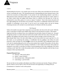 Our product that we have created for Element is a multipurpose jacket. This jacket will keep you warm when it cold and cool when it is hot. This multi-season jacket has a special feature for those adventurous skateboarders, with a not noticeable padding in the elbow area that gives a little more protection.